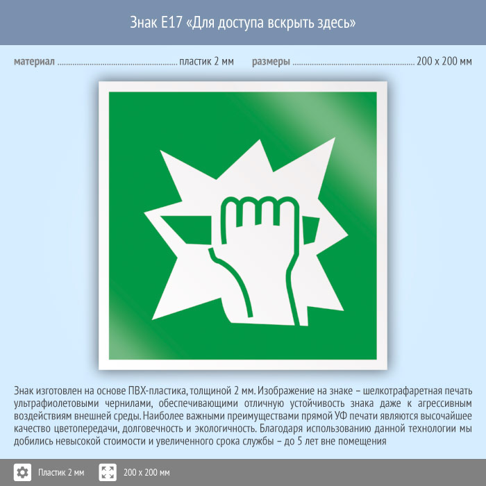 Знак E17 «Для доступа вскрыть здесь» (пластик, 200х200 мм) в Магнитогорске купить
