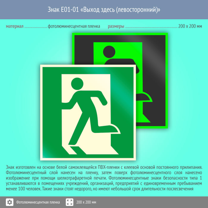 Знак E01-01 «Выход здесь (левосторонний)» (фотолюминесцентная пленка, 200х200 мм) в Магнитогорске купить