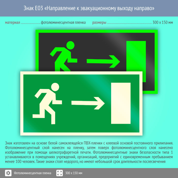 Знак E03 «Направление к эвакуационному выходу направо» (фотолюминесцентная пленка, 300х150 мм) в Магнитогорске купить