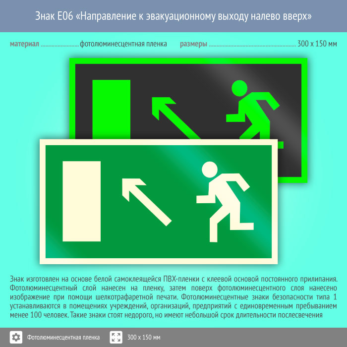 Знак E06 «Направление к эвакуационному выходу налево вверх» (фотолюминесцентная пленка, 300х150 мм) в Магнитогорске купить
