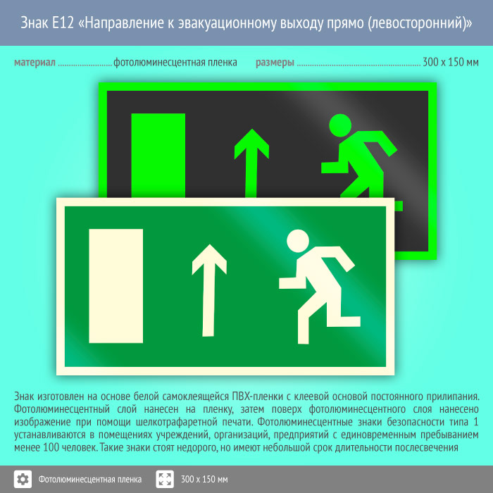 Знак E12 «Направление к эвакуационному выходу прямо (левосторонний)» (фотолюминесцентная пленка, 300х150 мм) в Магнитогорске купить