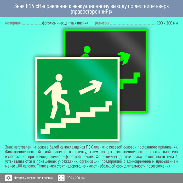Знак E15 «Направление к эвакуационному выходу по лестнице вверх (правосторонний)» (фотолюминесцентная пленка, 200х200 мм) в Магнитогорске купить