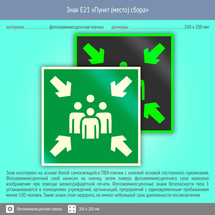 Знак E21 «Пункт (место) сбора» (фотолюминесцентная пленка, 200х200 мм) в Магнитогорске купить