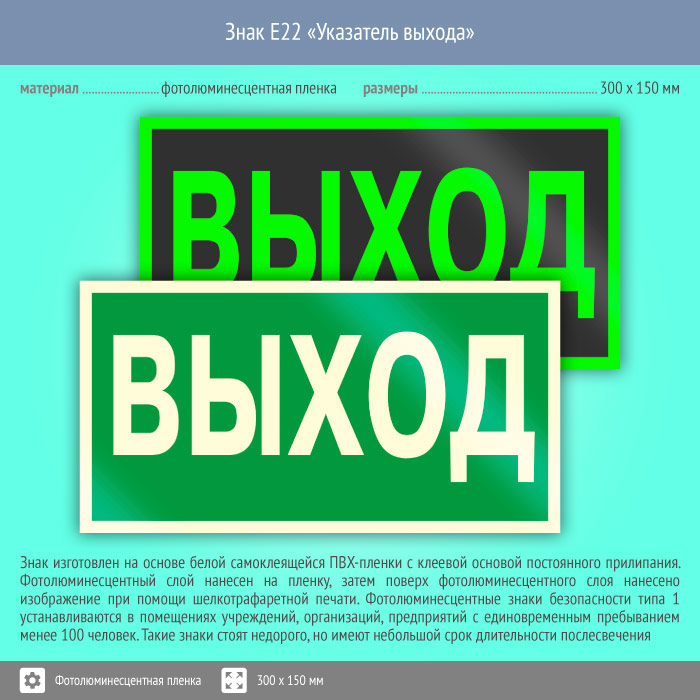 Знак E22 «Указатель выхода» (фотолюминесцентная пленка, 300х150 мм) в Магнитогорске купить