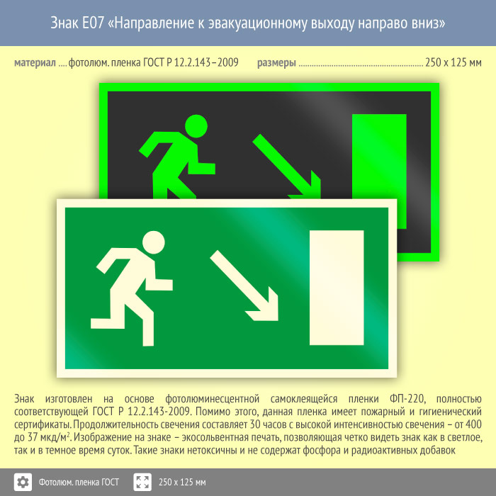 Знак E07 «Направление к эвакуационному выходу направо вниз» (фотолюминесцентная пленка ГОСТ 34428-2018, 250х125 мм) в Магнитогорске купить
