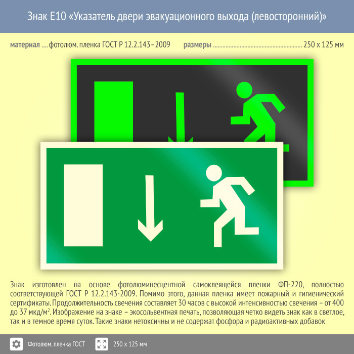 Знак E10 «Указатель двери эвакуационного выхода (левосторонний)» (фотолюминесцентная пленка ГОСТ 34428-2018, 250х125 мм) в Магнитогорске купить