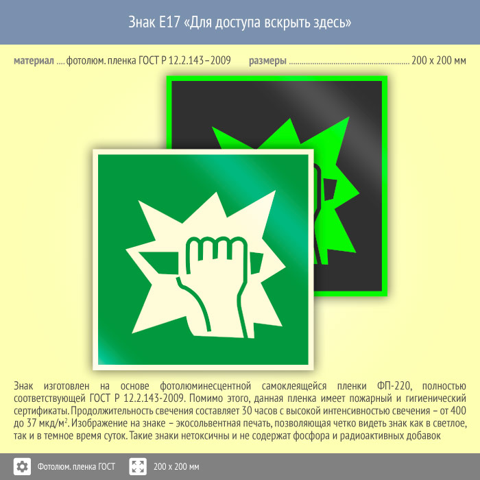 Знак E17 «Для доступа вскрыть здесь» (фотолюминесцентная пленка ГОСТ 34428-2018, 200х200 мм) в Магнитогорске купить
