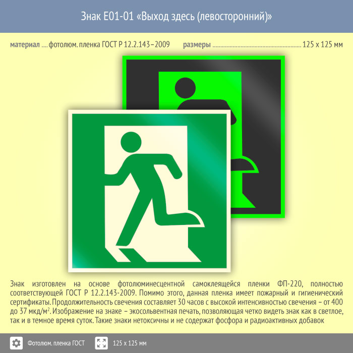 Знак E01-01 «Выход здесь (левосторонний)» (фотолюминесцентная пленка ГОСТ 34428-2018, 125х125 мм) в Магнитогорске купить