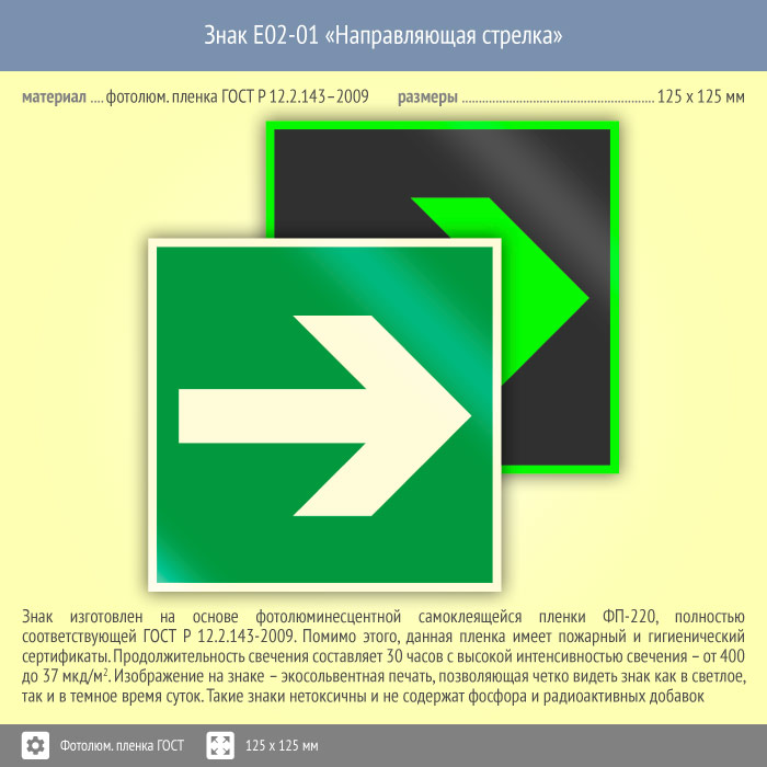 Знак E02-01 «Направляющая стрелка» (фотолюминесцентная пленка ГОСТ 34428-2018, 125х125 мм) в Магнитогорске купить