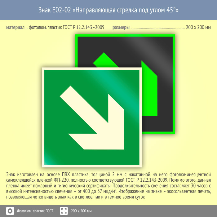 Знак E02-02 «Направляющая стрелка под углом 45°» (фотолюминесцентный пластик ГОСТ 34428-2018, 200х200 мм) в Магнитогорске купить
