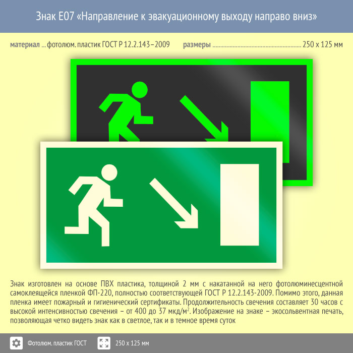 Знак E07 «Направление к эвакуационному выходу направо вниз» (фотолюминесцентный пластик ГОСТ 34428-2018, 250х125 мм) в Магнитогорске купить