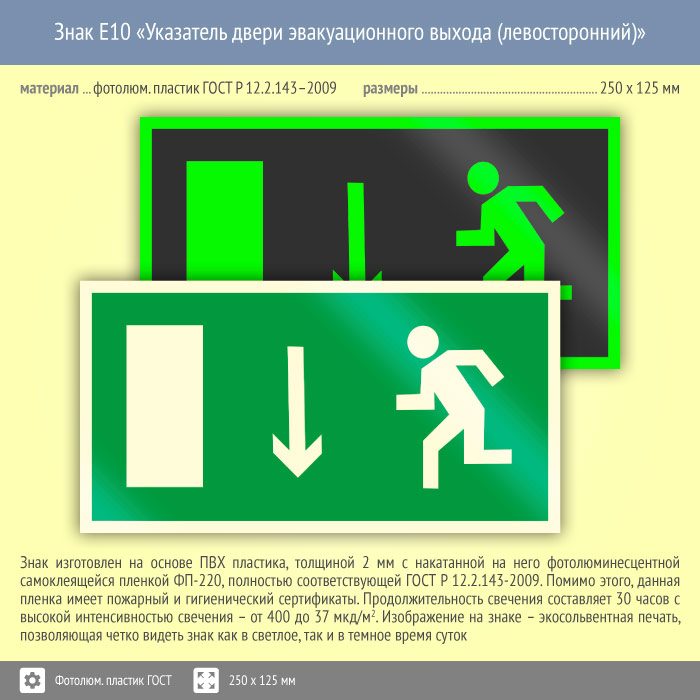 Знак E10 «Указатель двери эвакуационного выхода (левосторонний)» (фотолюминесцентный пластик ГОСТ 34428-2018, 250х125 мм) в Магнитогорске купить