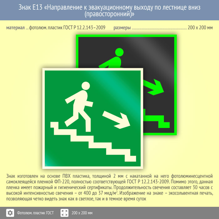 Знак E13 «Направление к эвакуационному выходу по лестнице вниз (правосторонний)» (фотолюминесцентный пластик ГОСТ 34428-2018, 200х200 мм) в Магнитогорске купить