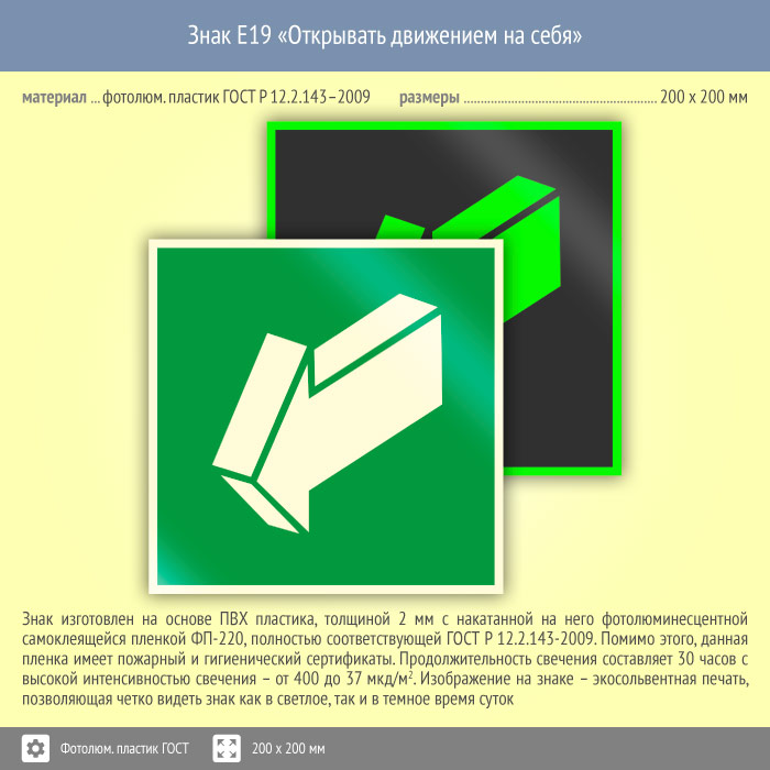 Знак E19 «Открывать движением на себя» (фотолюминесцентный пластик ГОСТ 34428-2018, 200х200 мм) в Магнитогорске купить