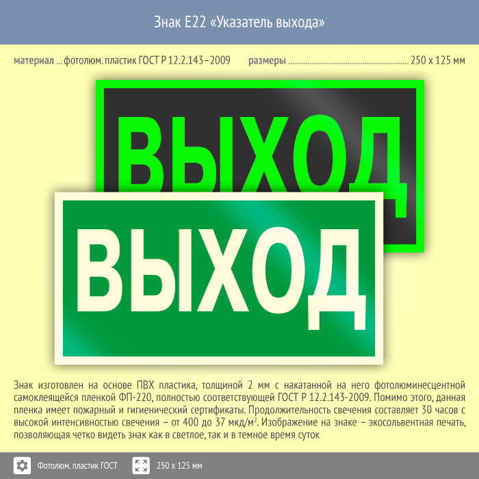 Знак E22 «Указатель выхода» (фотолюминесцентный пластик ГОСТ 34428-2018, 250х125 мм) в Магнитогорске купить