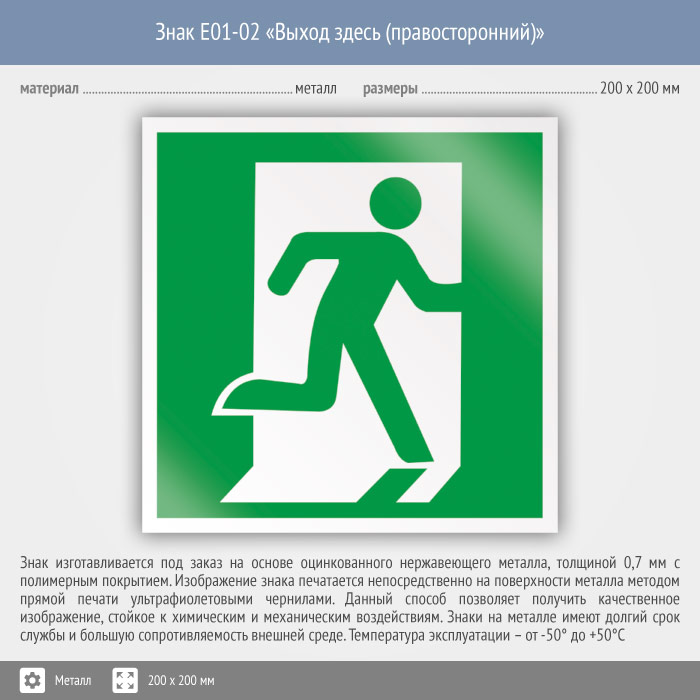 Знак E01-02 «Выход здесь (правосторонний)» (металл, 200х200 мм) в Магнитогорске купить