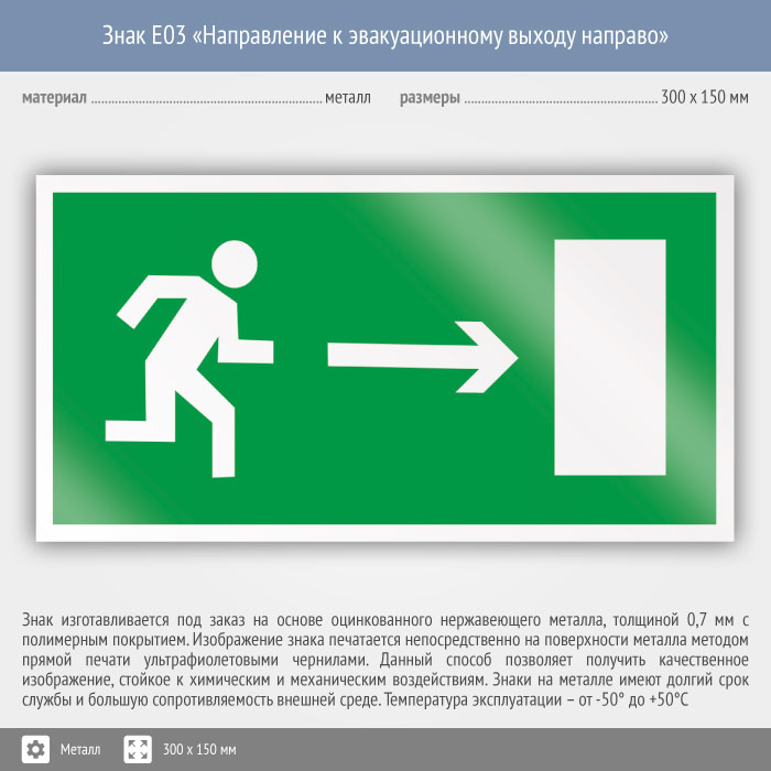 Знак E03 «Направление к эвакуационному выходу направо» (металл, 300х150 мм) в Магнитогорске купить