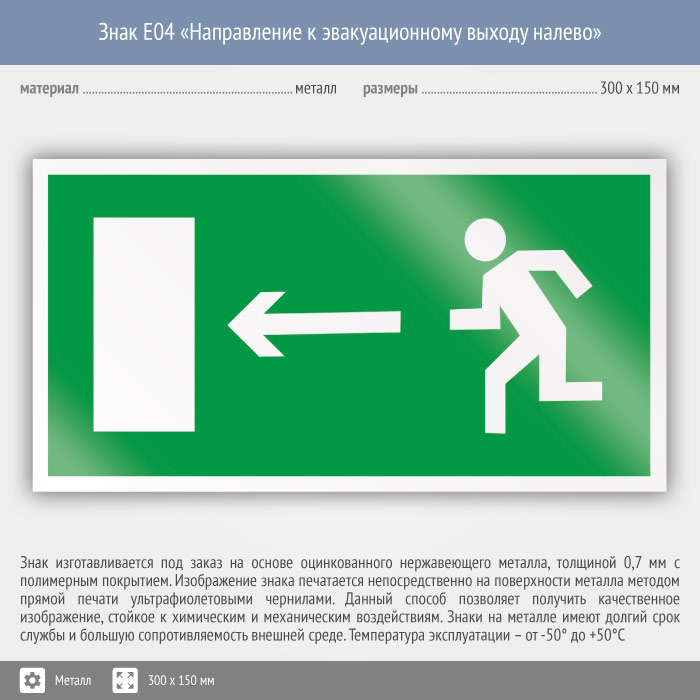 Знак E04 «Направление к эвакуационному выходу налево» (металл, 300х150 мм) в Магнитогорске купить
