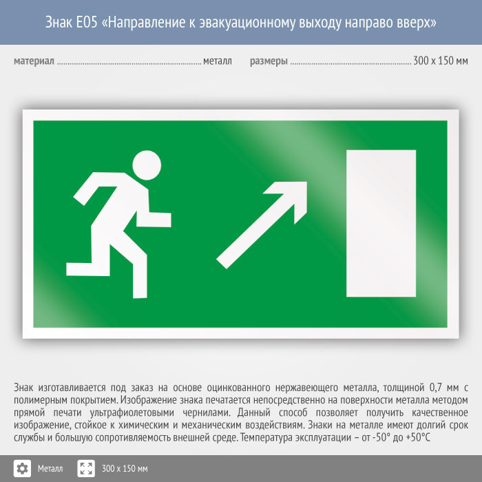 Знак E05 «Направление к эвакуационному выходу направо вверх» (металл, 300х150 мм) в Магнитогорске купить
