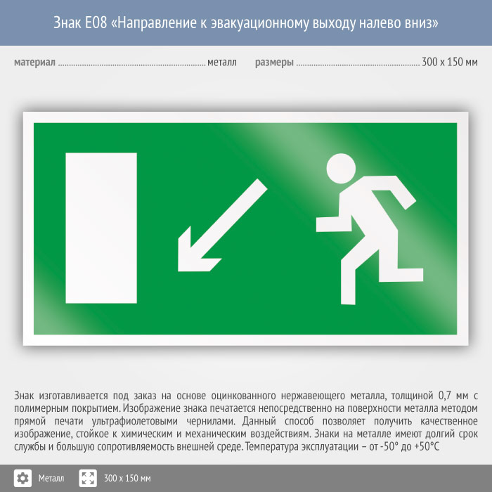 Знак E08 «Направление к эвакуационному выходу налево вниз» (металл, 300х150 мм) в Магнитогорске купить
