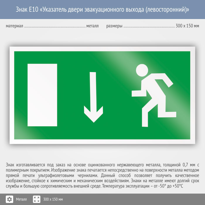 Знак E10 «Указатель двери эвакуационного выхода (левосторонний)» (металл, 300х150 мм) в Магнитогорске купить