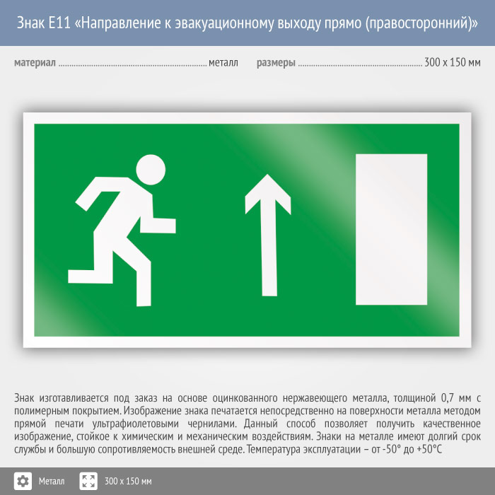 Знак E11 «Направление к эвакуационному выходу прямо (правосторонний)» (металл, 300х150 мм) в Магнитогорске купить