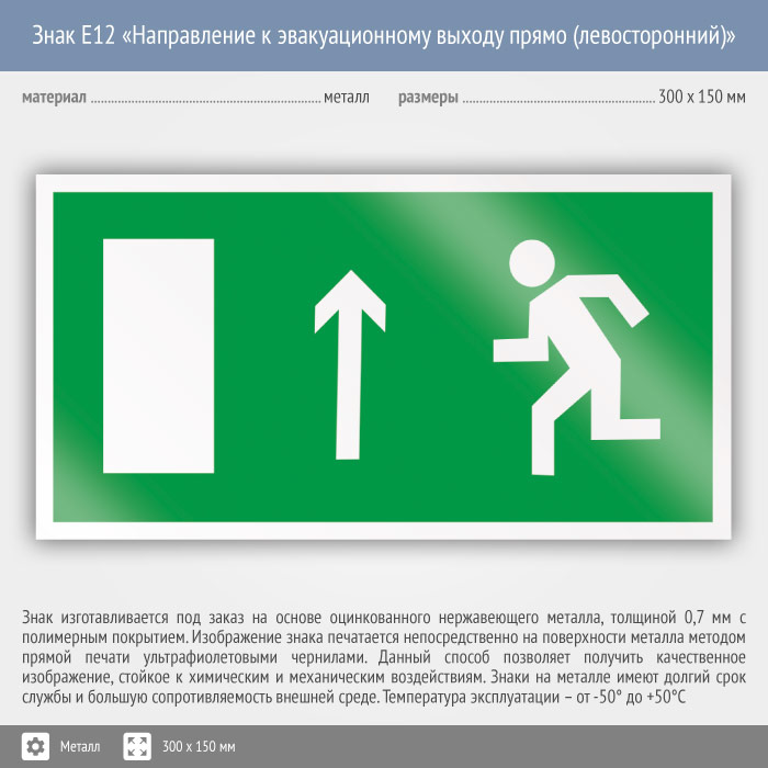 Знак E12 «Направление к эвакуационному выходу прямо (левосторонний)» (металл, 300х150 мм) в Магнитогорске купить