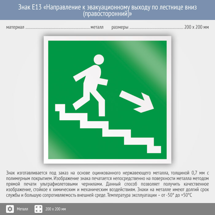 Знак E13 «Направление к эвакуационному выходу по лестнице вниз (правосторонний)» (металл, 200х200 мм) в Магнитогорске купить