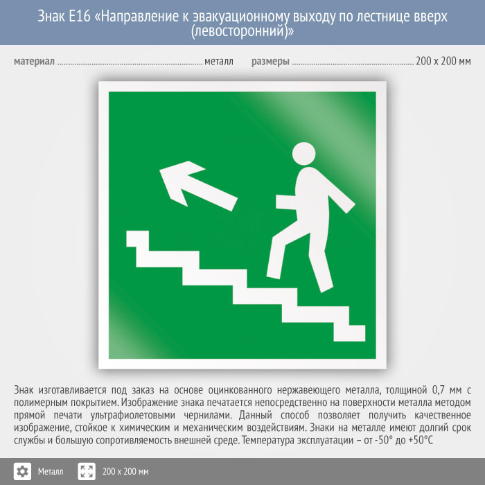 Знак E16 «Направление к эвакуационному выходу по лестнице вверх (левосторонний)» (металл, 200х200 мм) в Магнитогорске купить