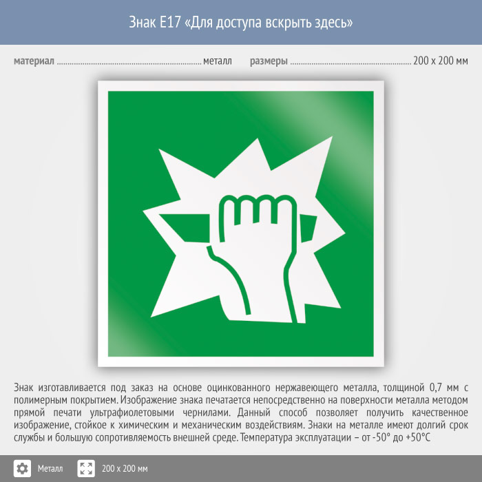 Знак E17 «Для доступа вскрыть здесь» (металл, 200х200 мм) в Магнитогорске купить