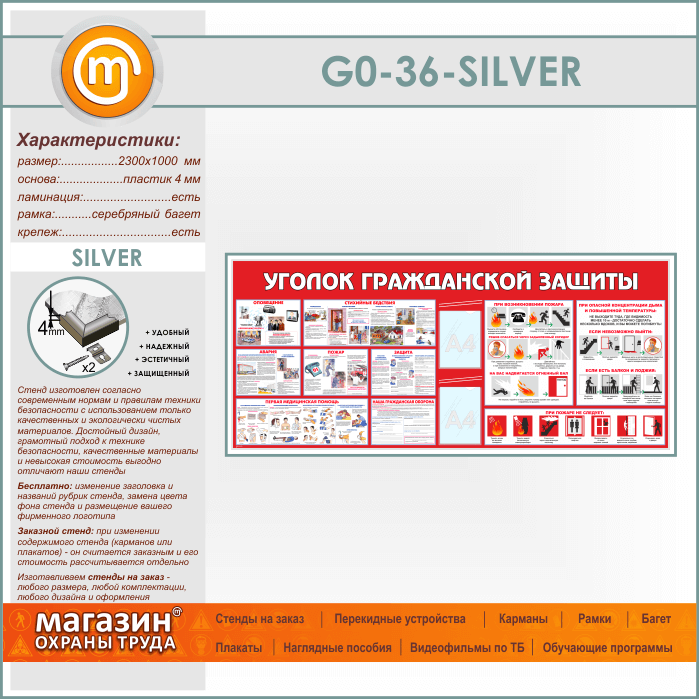 Стенд «Уголок гражданской защиты» c 2 карманами (GO-36-SILVER) в Магнитогорске купить