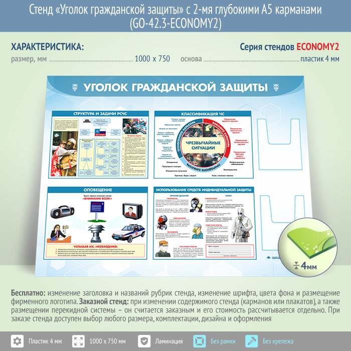 Стенд «Уголок гражданской защиты» с 2-мя глубокими А5 карманами (GO-42.3-ECONOMY2) в Магнитогорске купить
