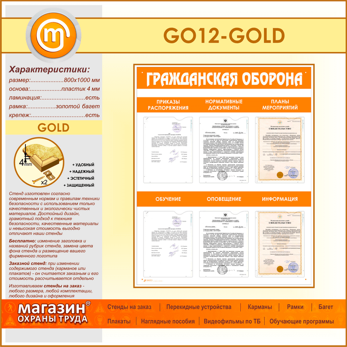 Стенд «Гражданская оборона» с 6 плоскими карманами (GO-12-GOLD) в Магнитогорске купить