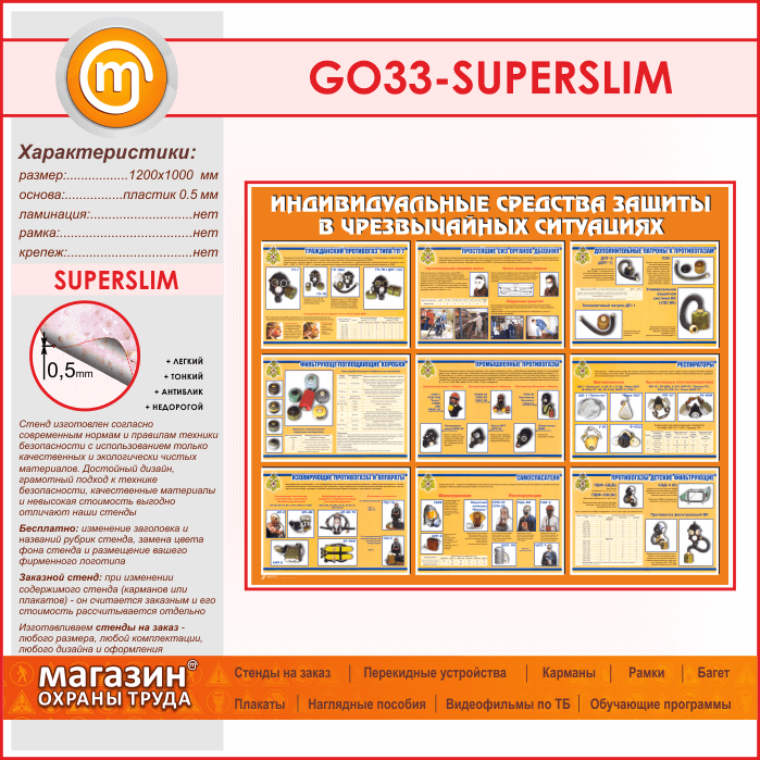 Стенд «Индивидуальные средства защиты в чрезвычайных ситуациях» (GO-33-SUPERSLIM) в Магнитогорске купить
