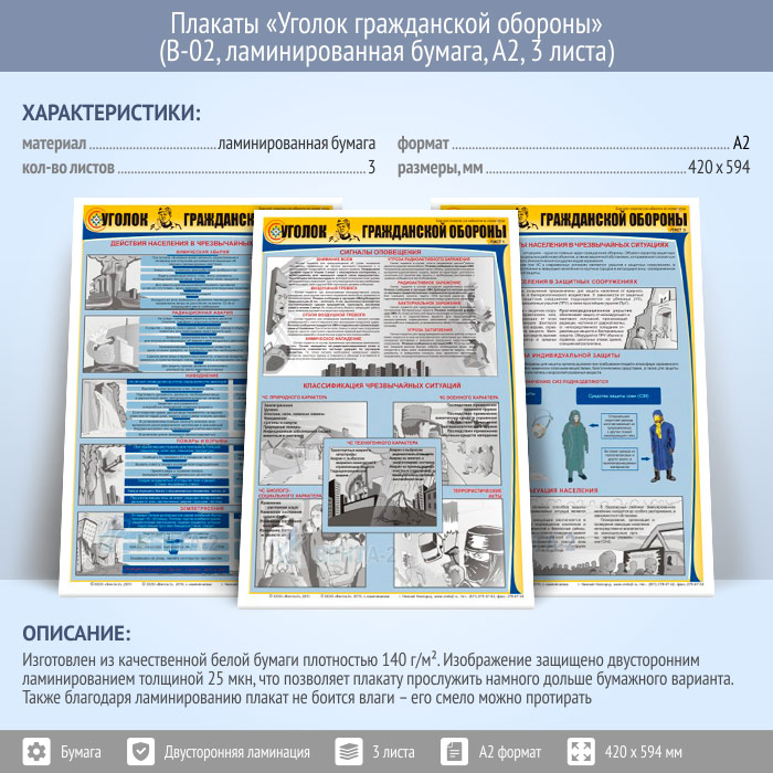 Плакаты «Уголок гражданской обороны» (В-02, ламинированная бумага, А2, 3 листа) в Магнитогорске купить