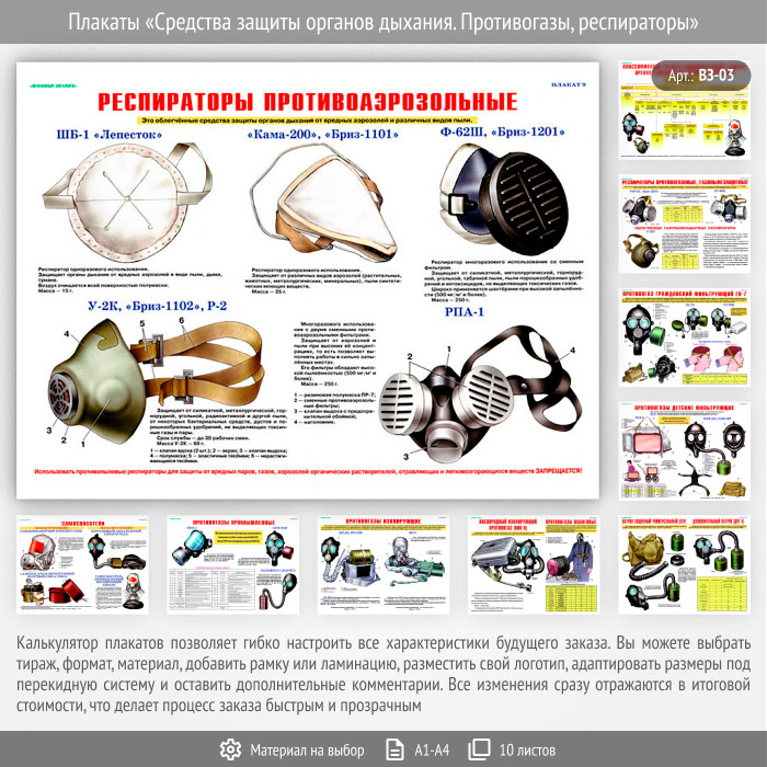 Плакаты «Средства защиты органов дыхания. Противогазы, респираторы» (ВЗ-03, 10 листов) в Магнитогорске купить
