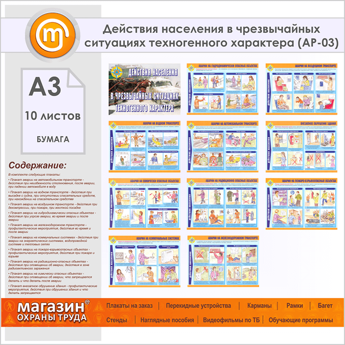 Плакаты «Действия населения в чрезвычайных ситуациях техногенного характера» (АР-03, бумага, А3, 10 листов) в Магнитогорске купить