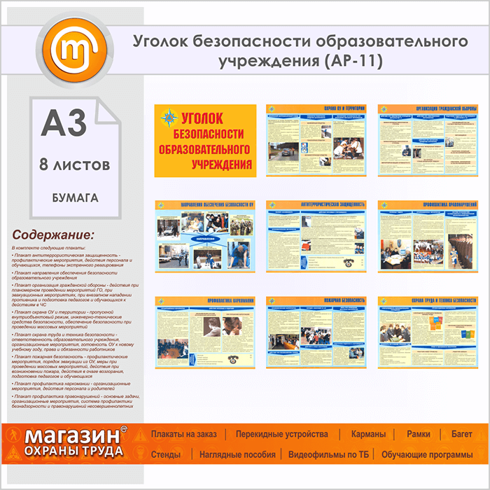 Плакаты «Уголок безопасности образовательного учреждения» (АР-11, бумага, А3, 8 листов) в Магнитогорске купить