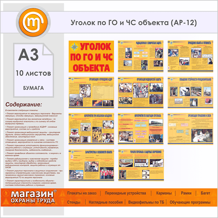 Плакаты «Уголок по ГО и ЧС объекта» (АР-12, бумага, А3, 10 листов) в Магнитогорске купить