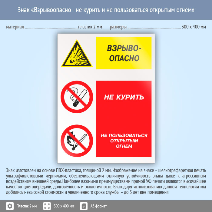 Знак «Взрывоопасно - не курить и не пользоваться открытым огнем», КЗ-08 (пластик, 300х400 мм) в Магнитогорске купить
