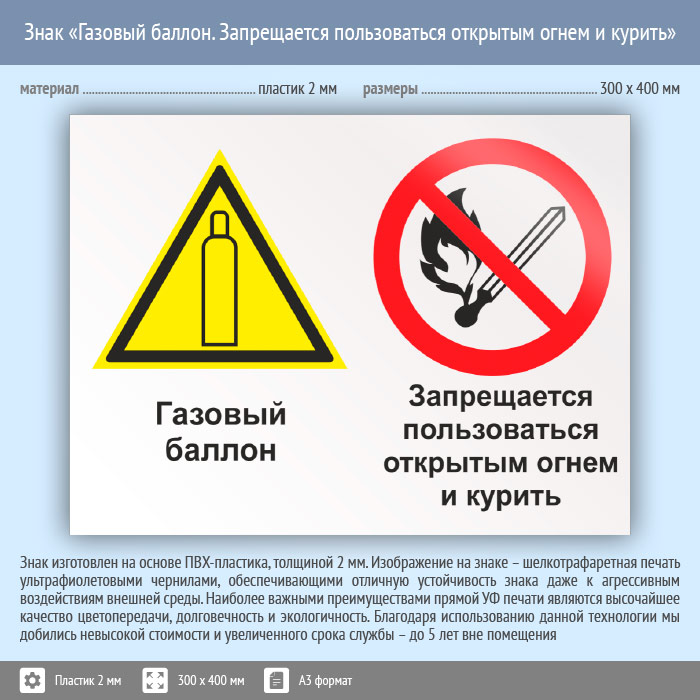 Знак «Газовый баллон. Запрещается пользоваться открытым огнем и курить», КЗ-19 (пластик, 400х300 мм) в Магнитогорске купить