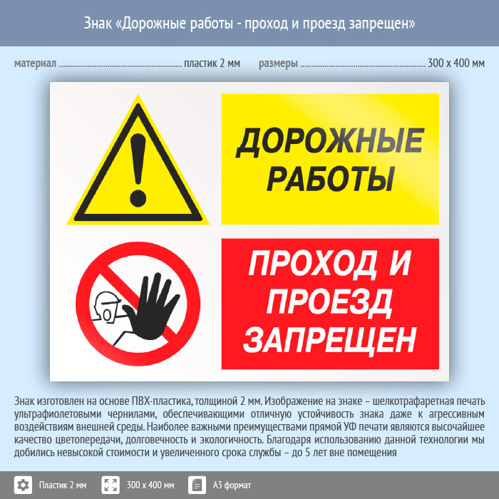 Знак «Дорожные работы - проход и проезд запрещен», КЗ-20 (пластик, 400х300 мм) в Магнитогорске купить
