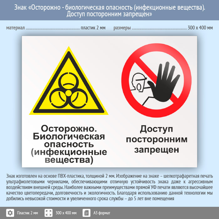 Знак «Осторожно - биологическая опасность (инфекционные вещества). Доступ посторонним запрещен», КЗ-51 (пластик, 400х300 мм) в Магнитогорске купить