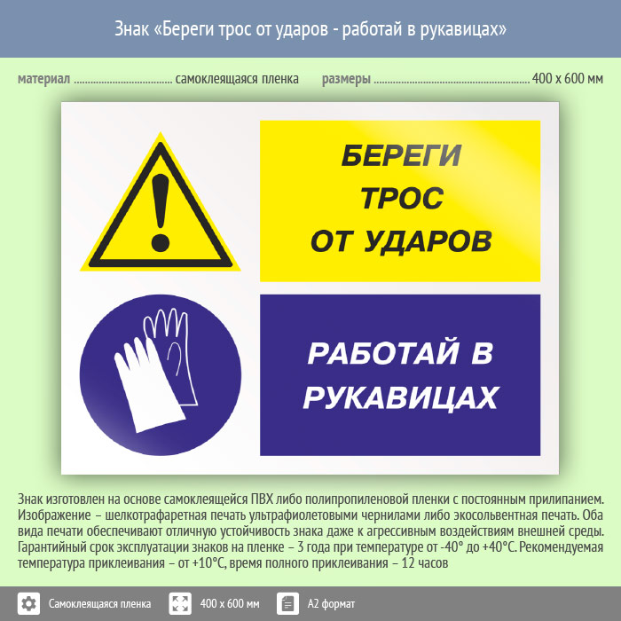 Знак «Береги трос от ударов - работай в рукавицах», КЗ-03 (пленка, 600х400 мм) в Магнитогорске купить