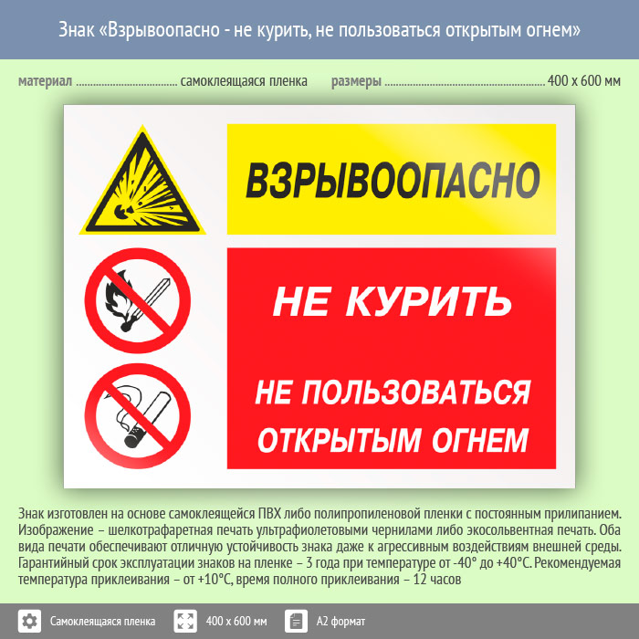 Знак «Взрывоопасно - не курить, не пользоваться открытым огнем», КЗ-05 (пленка, 600х400 мм) в Магнитогорске купить