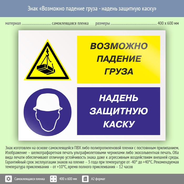 Знак «Возможно падение груза - надень защитную каску», КЗ-17 (пленка, 600х400 мм) в Магнитогорске купить