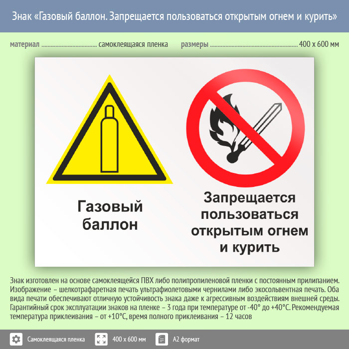 Знак «Газовый баллон. Запрещается пользоваться открытым огнем и курить», КЗ-19 (пленка, 600х400 мм) в Магнитогорске купить