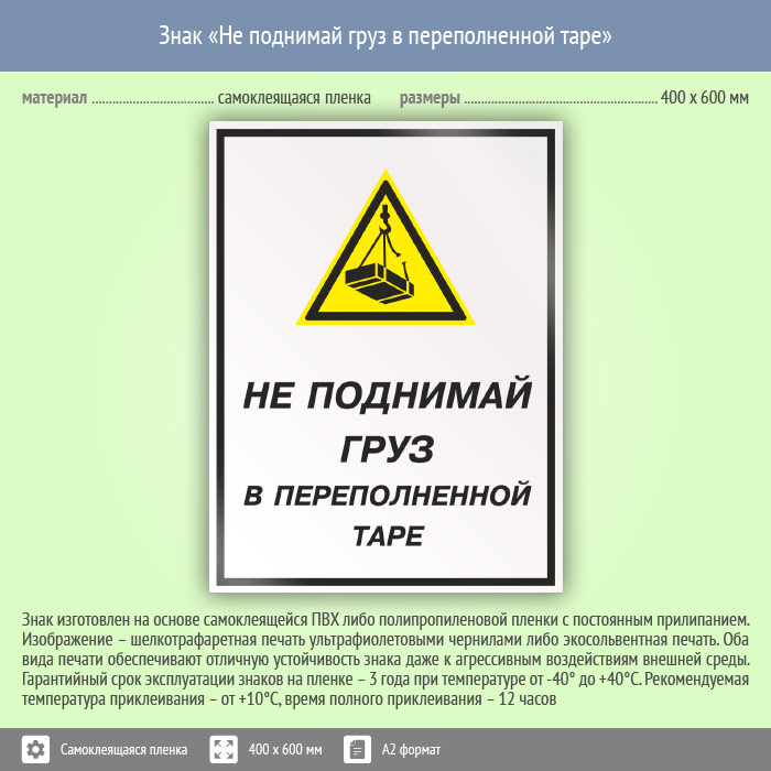 Знак «Не поднимай груз в переполненной таре», КЗ-26 (пленка, 400х600 мм) в Магнитогорске купить