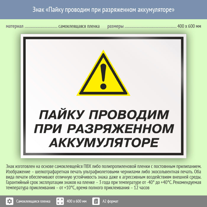 Знак «Пайку проводим при разряженном аккумуляторе», КЗ-62 (пленка, 600х400 мм) в Магнитогорске купить