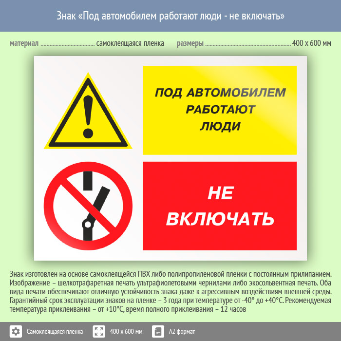 Знак «Под автомобилем работают люди - не включать», КЗ-65 (пленка, 600х400 мм) в Магнитогорске купить